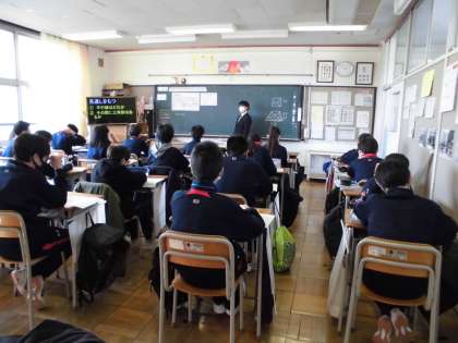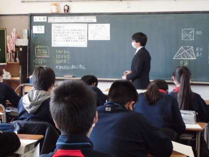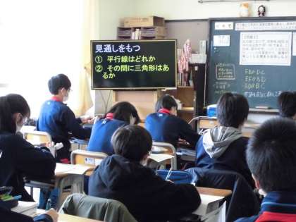 東京教師道場の公開授業を2年生の数学で実施しました。今日は図の中から面積が等しい三角形を見つけ、説明できるようになることが目標でした。感染症防止のために生徒同士の話合いが思うようにできない中、工夫をして問題の捉え方・考え方を共有していました。