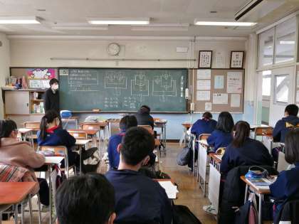 3年生の理科の授業では、2年生の内容をテストと解説によりふりかえっていました。