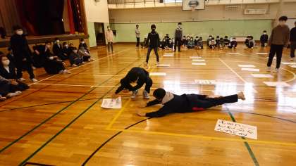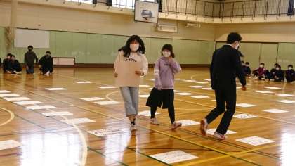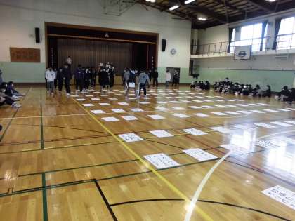 事前に作った下の句が書かれた大札を体育館いっぱいに並べ、二人一組が順番に各クラス4カ所の待機場所から大札を取りに行きます。