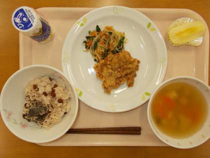 卒業のお祝いのお赤飯とみんな大好き鶏のから揚げです。