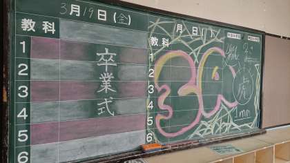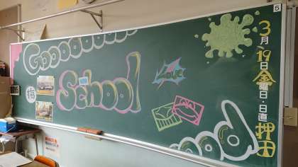 クラスの黒板に嬉しい気持ち、決意の気持ちがあらわれています。3A
