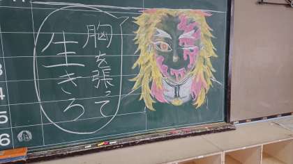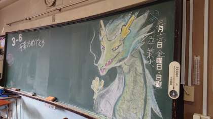 クラスの黒板に嬉しい気持ち、決意の気持ちがあらわれています。3B
