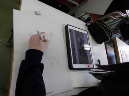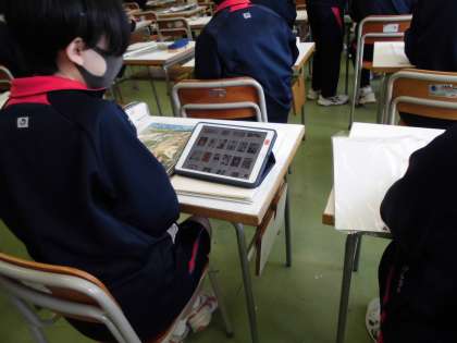 3年生は「日本画」を制作しています。作成するにあたって、下地の絵の日本画をiPadで調べています。 描きたい日本画が見つかったら拡大すると細部までよく分りとても便利です。 今から仕上がりが楽しみです。