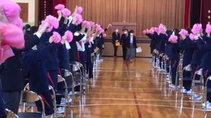 代表生徒がお世話になった先生方に手紙を渡し、桜の花道をイメージした手作りのお花を掲げながらお見送りしました。