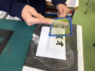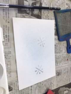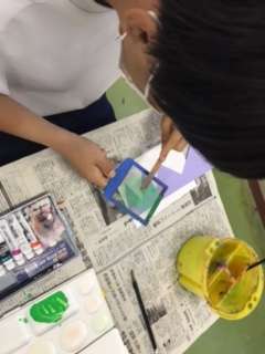 美術の授業で、金網から絵の具を落として、模様を作っています。