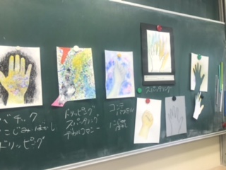 2年生の美術ではこれまで学習してきた方法でさまざまな方法で、「手の気持ち」を表す活動をしています。