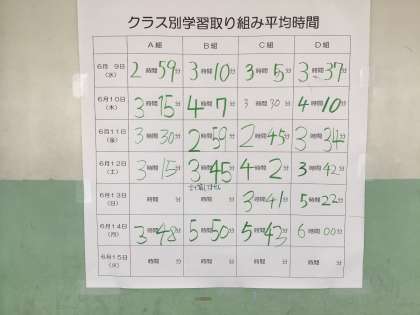 クラスごとに学習計画表に記録した学習取り組みの平均時間を計算し、廊下に掲示しています。全体では少しずつ学習に取り組む時間が増えているようです。努力が実を結ぶといいですね。長い時間集中し続けることは難しいです。効果的に休憩を入れて集中し、勉強の「質」も高めましょう。