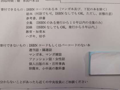 > 来週の水曜日まで、主に本の回収を行っています。その他にも、写真であげたような物を回収しておりますどうぞ、ご協力お願いします。