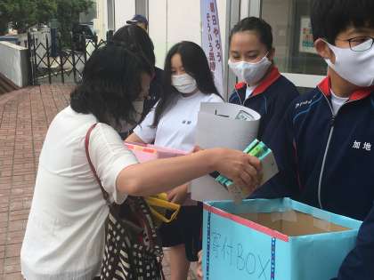 寄付回収BOXを作ったりと、毎日工夫して呼びかけを行っております。