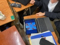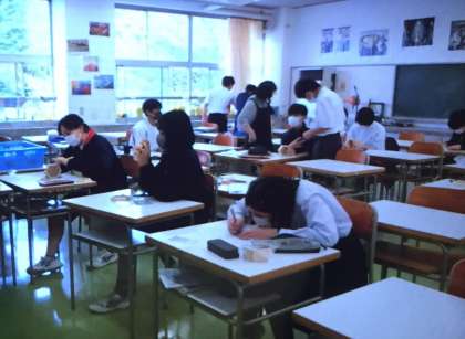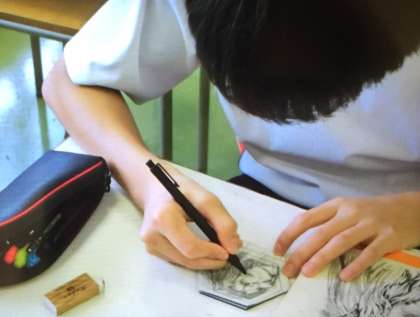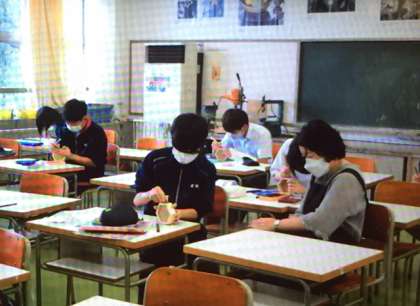 木箱のデザインを考え、彫刻刀で彫り進めていました。