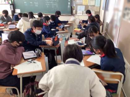 タブレットを活用し、班員と協力しながら学習を進めていました。