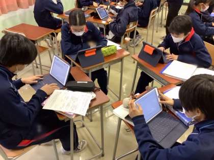 英語の授業では、グループごとにトピックを設定し、クラスメートに調査しています。