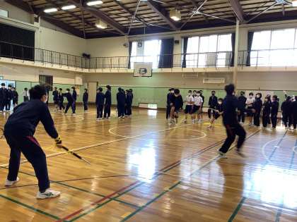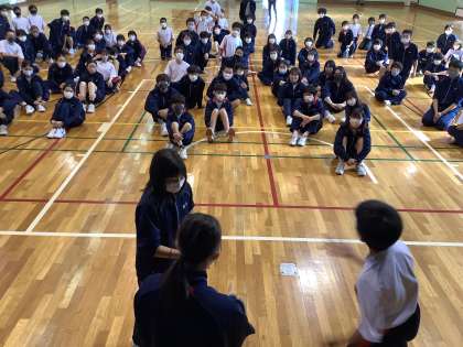 4月11日月曜日の6校時に体育館にて学年集会を行いました。クラス替えをして間もない時期のため、学級内の親睦が深まるように体を動かすレクリエーションとして大繩に挑戦しました。大変な縄の回し手に立候補してくれる人、うまく跳べない人にアドバイスをしてくれる人、大きな声で数を数えて盛り上げてくれる人。協力する姿勢がよく表れていたと思います。