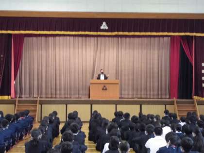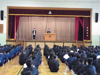 本年度初めての生徒会集会をしました。生徒会役員の生徒たちが、「標準服」や「ジャージ」の正しい着方(身だしなみ)について説明をしました。また、来月開催予定の体育祭のスローガンの募集についても話をしました。どちらもとても分かりやすくて良い説明でした。