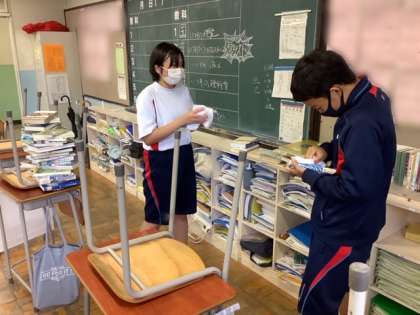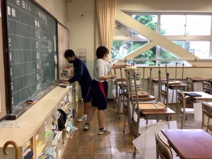 図書委員の生徒たちが、学級文庫を一冊ずつ丁寧にタオルで拭き、綺麗にした後、本の整理を行っていました。