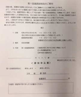 明日、5/31(火)は3年生の進路説明会の参加確認書の提出日となっています。(3年生は参加、不参加に関わらず、全員提出です。期日内の提出にご協力ください。)