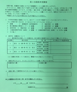 また、5/26(木)に第一回進路希望調査(緑色の用紙)を配布しました。進路説明会に先立ち、中学校卒業後の進路についてご家庭で話し合う機会を作っていただければ幸いです。提出締切は6/6(月)です。