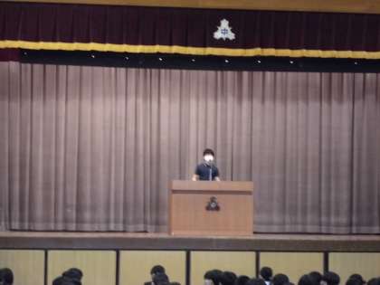 本日は生徒会朝礼の日でした。各委員会から連絡があり、その後、生徒会から標準服や体操着、ジャージの正しい着方について説明がありました。模範を示しながら説明をしていたので、非常に分かりやすいものでした。