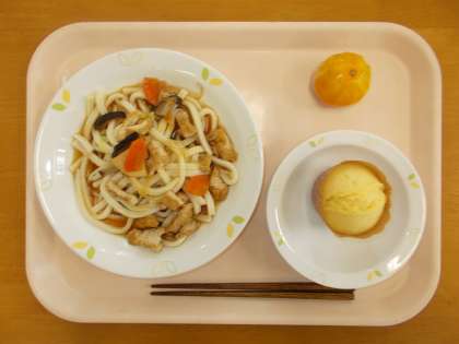 冷やしうどん 蒸しパン 果物(冷凍みかん)