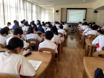 職場体験ガイダンスをランチルームにて行いました。職場体験の目的を確認し、体験する事業所の種類について説明を聞きました。「教育」「小売店・サービス業」「福祉」「工業」「公共」「食品」「保安」の中から希望を取ります。受け入れ先の事情により、希望する分野で体験できない可能性もあります。どの体験先になっても精一杯体験をしてきてください。そして、将来の職業選択に活かしましょう。