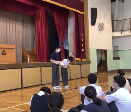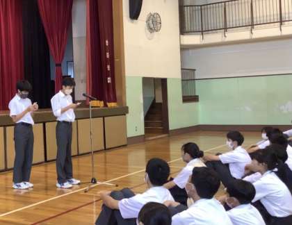 1学期の学習や生活の様子をクラスごとに振り返り、頑張ったところや2学期に向けて改善すべきところなどを代表生徒が発表しました。