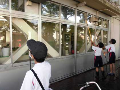 松原小学校と代田小学校の児童が部活動体験に来てくれたり、外部指導員の方々がご指導に来てくださっています。そこでJRCは皆様方に綺麗な玄関からお迎えしようと、玄関周りを水で綺麗に掃除をしました。皆様をお迎えするにふさわしい、ピカピカの玄関となりました!