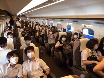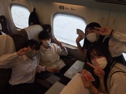 車内は、カードゲームや写真撮影などで盛り上がっています。