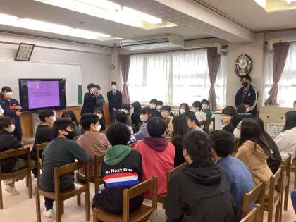 学校紹介のため、生徒会中央役員が代田小学校を訪問しました。自分たちの実感を交えて梅中での学校生活や魅力を伝えました。