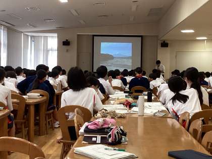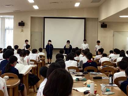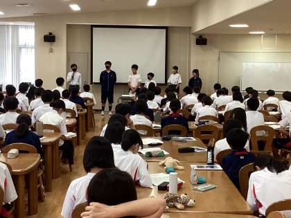 河口湖移動教室に向けての学年集会をランチルームで行いました。
