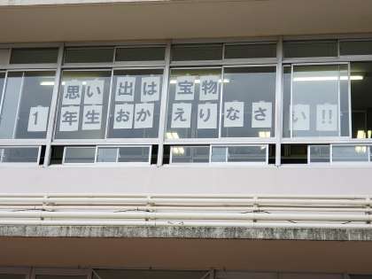 写真は廊下の窓に張り出された歓迎の言葉です。