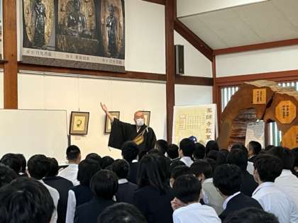 薬師寺に到着しました。真剣にお話を聞いています。