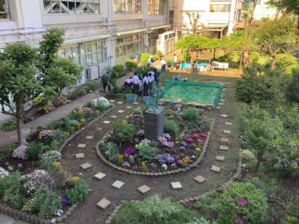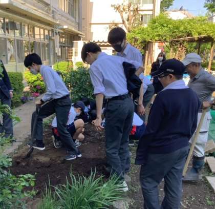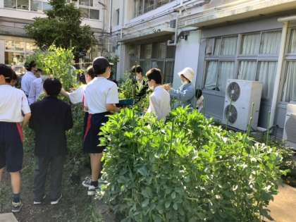 夏野菜を植える予定にしていたので、天候に恵まれ安堵。放課後の中庭にはたくさんの部員が集まりました。