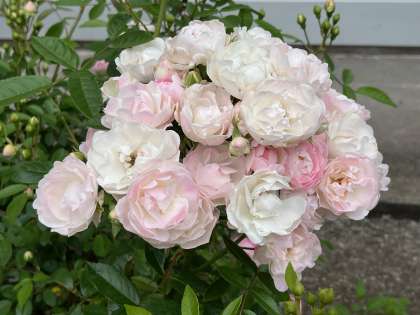中庭では、バラが少しずつ花を咲かせています。素敵な花束があちこちに完成しています!