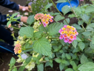 2枚目の写真は「ランタナ」という花で別名、「七変化」だそうです。日が経つと色味が次第に変わるそうです。同じ茎についた花も色味に違いがあり、園芸部員も心惹かれていました!