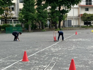 前日に降り続いた雨が上がりました。学年練習に向けて、朝早くから体育委員が集まり、グラウンド整備を手伝ってくれました!
