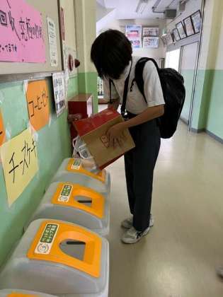 今朝の昇降口。生徒が大量のペットボトルキャップを持ってきてくれました!連日、順位も変動しているようです。結果発表が楽しみです!
