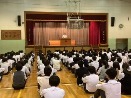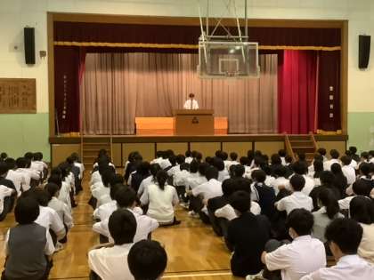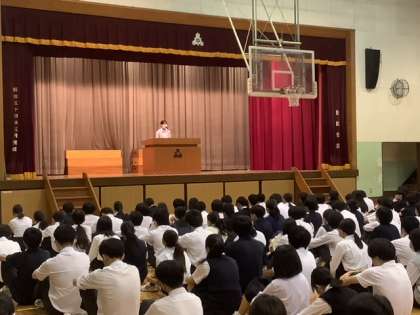 ?生徒会朝会では、学芸発表会実行委員から合唱コンスローガンについての報告、生徒会中央役員会からは服装について、オンライン意見箱、エコキャップ回収の報告が行われました。