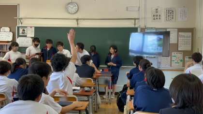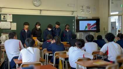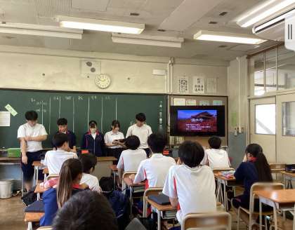 9月末に行われる修学旅行に向けた学習を進めています。班ごとに学習テーマや班行動コースが決まり、調べた情報を元に中間報告を行いました。