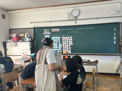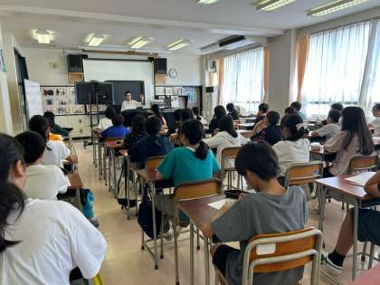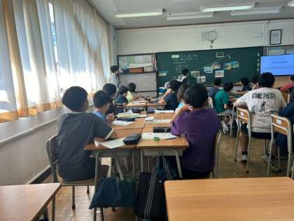 今日は松原小学校から児童が来て、社会、家庭科、音楽のどれかを受けています!