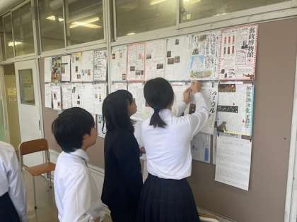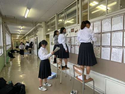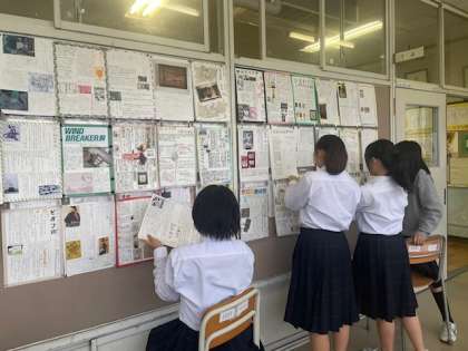 美術科の夏期課題で「美術館へ行こう」の展覧会訪問ポスターを展示しました。美術係を中心にお手伝いの生徒たちが残って教室前に掲示してくれました。