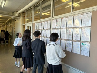 1月9日(木)、1学年は6時間目の総合で、冬休み課題「国調べ新聞」の掲示と見学を行いました。