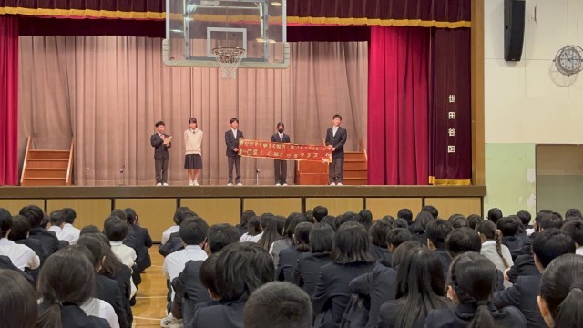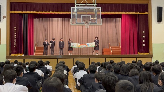 各クラスの「学級目標、授業規律やいじめ防止に関する取組、SNSルール」について代表生徒が発表しました!写真は1年生の発表の様子です。堂々とした雰囲気が印象的でした。