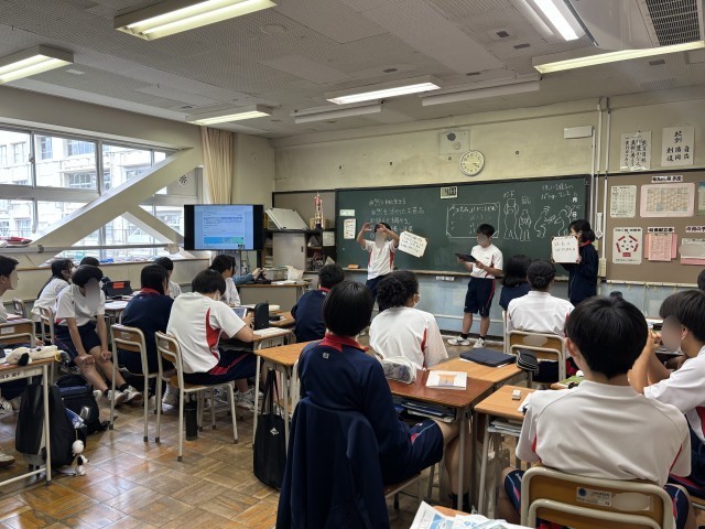 3年生の日本語では伝統工芸を取り扱う内容があります。今回は3人程度の小グループに分かれどのようなものがあるのか、パフォーマンスを交えながら発表しました。写真は何の伝統工芸を発表しているか分かりますか??