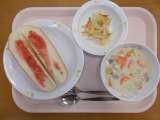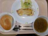 パインパン オニオンスープ 鮭のパン粉焼き レッドピースと野菜のサラダ