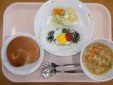 10月21日(月)の給食 牛乳 胚芽パン アルファベットスープ 巣ごもりたまご ...