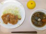 10月22日(火)の給食 牛乳 みそカツ丼 けんちん汁 果物(みかん)