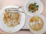 10月23日(水)の給食 牛乳 子ぎつねご飯 粕汁 焼きししゃも 小松菜のおかか...