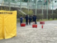 体育館・格技室では、応急手当てや避難スペース、簡易トイレの作り方などを練習してい...