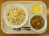 2月16日(金)の給食 牛乳 ピラフ 豚肉と野菜のスープ チーズケーキ