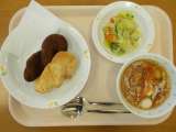2月6日(火)の給食 牛乳 ミルクパン 野菜スープ えびグラタン フレンチサラダ...
